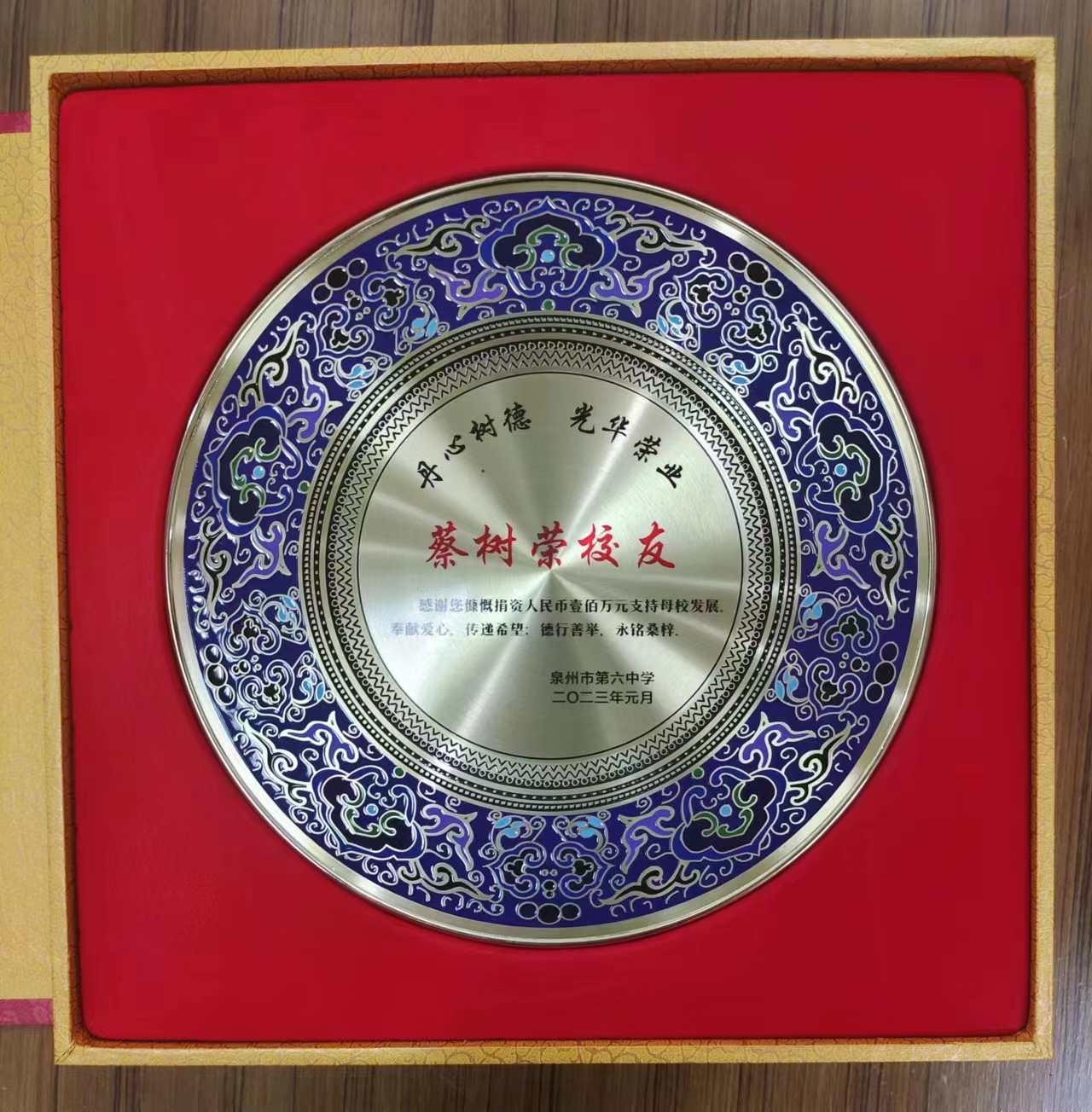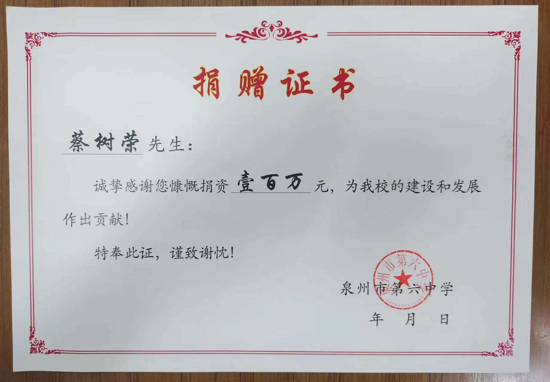 2023年6月15日,集团董事长蔡树荣捐赠母校泉州六中泓毅教育基金会壹佰万元,支持母校发展。